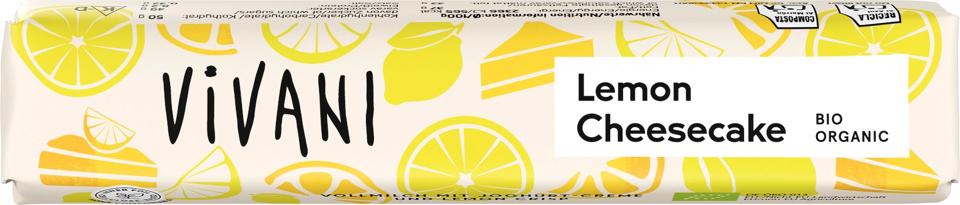 BATON MLECZNA CZEKOLADA Z NADZIENIEM SERNIK CYTRYNOWY BIO 40 g – VIVANI