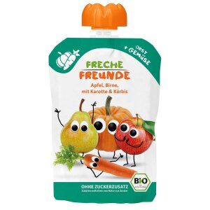 koncentrat soku jabłkowego* 44 %, suszone banany* 31 %, płatki OWSIANE* 11 %, mąka ryżowa*, oblat wafel ORKISZOWY* 6 % (mąka z PSZENICY ORKISZ*, skrobia ziemniaczana*), olej słonecznikowy*. (* certyfikowany składnik ekologiczny)