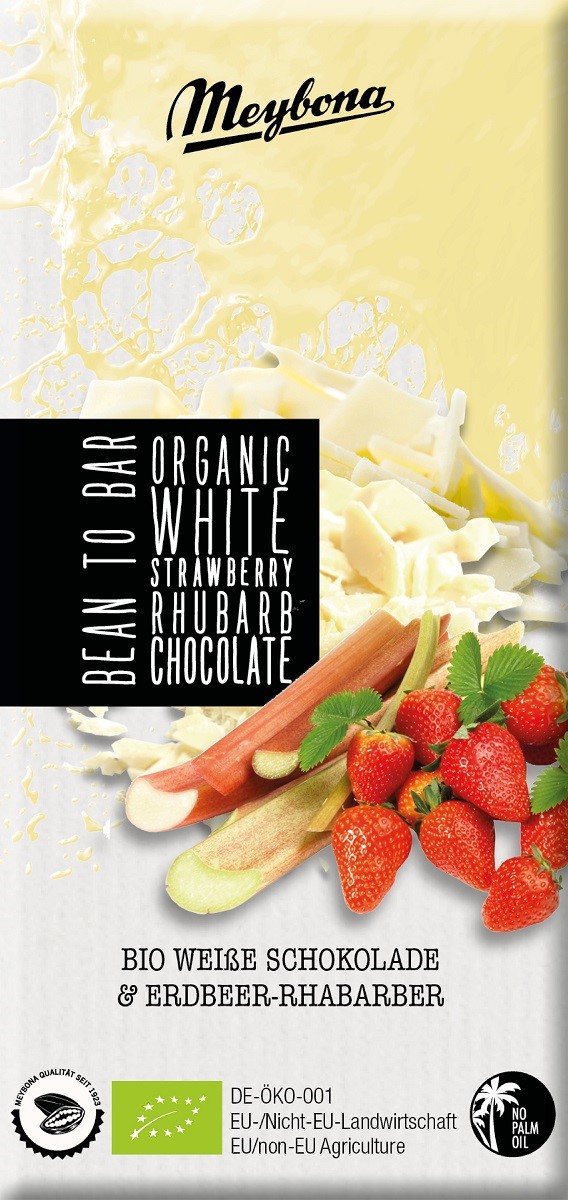 CZEKOLADA BIAŁA Z TRUSKAWKAMI I RABARBAREM BIO 100 g – MEYBONA
