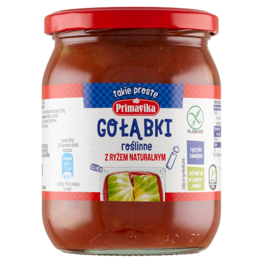 GOŁĄBKI WEGAŃSKIE Z RYŻEM I PIECZARKAMI W SOSIE POMIDOROWYM BEZGLUTENOWE 480 g – PRIMAVIKA