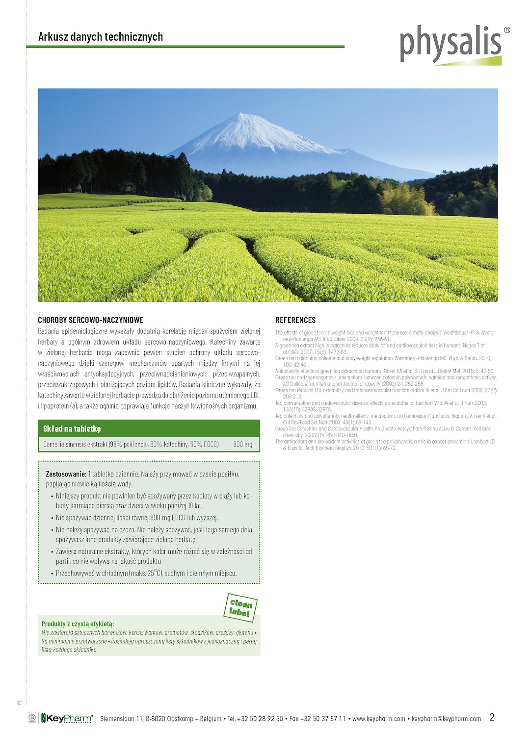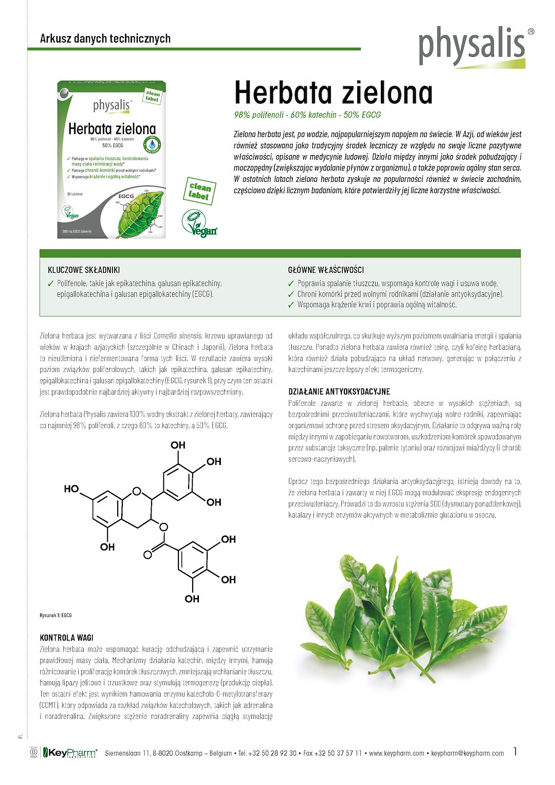Physalis Green Tea zawiera wodny ekstrakt z zielonej herbaty z nie mniej niż 98 % polifenoli i 60 % katechin, z czego 50 % to najszerzej badana katechina, mianowicie EGCG lub galusan epigallokatechiny-3.