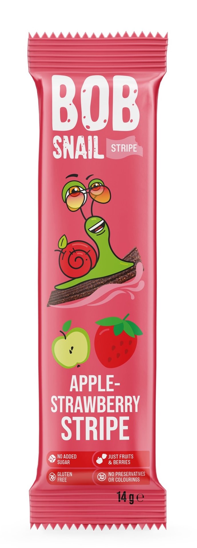 PRZEKĄSKA STRIPE JABŁKO – TRUSKAWKA BEZ DODATKU CUKRÓW BEZGLUTENOWA 14 g – BOB SNAIL