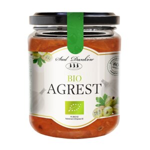 SKŁADNIKIagrest*, koncentrat jabłkowy*, substancja zagęszczająca – pektyny, regulator kwasowości – kwas askorbionowy. (*certyfikowany składnik ekologiczny) OPIS 100 g produktu sporządzono z 80 g owoców. Produkt pasteryzowany otrzymany przez odszypułkowanie owoców agrestu z dodatkiem koncentratu jabłkowego w celu otrzymania odpowiedniego poziomu pH. WARTOŚĆ ODŻYWCZA W 100 g Wartość energetyczna – 454 kJ/107 kcal Tłuszcz –