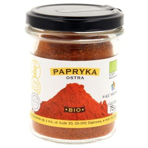 SKŁADNIKIekologiczna papryka ostra mielona. OPISPapryka w kuchni;– do dań mięsnych i rybnych,– do zup i sosów,– do dań warzywnych– do dań kuchni węgierskiej. INFORMACJA ALERGENNAMoże zawierać ORZECHY. ZALECANE WARUNKI PRZECHOWYWANIAPrzechowywać w suchym i chłodnym miejscu, szczelnie zamknięte.