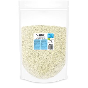 SKŁADNIKIekologiczne NASIONA SEZAMU białego niełuskanego 100 %. OPISPolecamy jako dodatek do makaronów, zup, sałatek i przekąsek. Przed spożyciem można poddać obróbce termicznej. WARTOŚĆ ODŻYWCZA W 100 gWartość energetyczna 2429 kJ/588 kcalTłuszcz 50 gw tym kwasy tłuszczowe nasycone 6,8 gWęglowodany 10 gw tym cukry 0,2 gBłonnik 11 gBiałko 18 gSól 0,1 g INFORMACJA ALERGENNAProdukt może zawierać:…