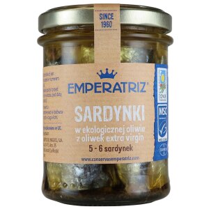 SKŁADNIKISARDYNKA europejska (Sardina Pilchardus), oliwa z oliwek najwyższej jakości z pierwszego tłoczenia* 30 %, sól (*certyfikowane składniki ekologiczne). 30 % składników pochodzi z certyfikowanych upraw ekologicznych. OPISObszar połowu: Atlantyk Północno-Wschodni. Opakowanie zawiera 5-6 sardynek. Produkt sterylizowany. WARTOŚĆ ODŻYWCZA W 100 gWartość energetyczna: 1368 kJ/330 kcal Tłuszcz: 29 g w tym kwasy tłuszczowe nasycone: 5,8 g…