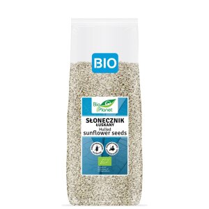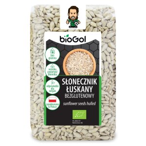 SKŁADNIKIekologiczny słonecznik łuskany 100 %. OPISEkologiczne ziarno słonecznika doskonałe jako samodzielna przekąska oraz jako wzbogacający smakowo dodatek do wypieków, deserów, musli i sałatek. Wyśmienicie smakuje uprażony na patelni. Wartość odżywcza w 100 gWartość energetyczna 2537 kJ/613 kcalTłuszcz 52 gw tym kwasy tłuszczowe nasycone 4,5 gWęglowodany 11 gw tym cukry 2,6 gBłonnik 8,6 gBiałko 21 gSól…