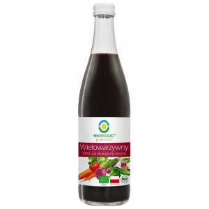 SKŁADNIKI sok z kiszonych: buraków* (35 %), pomidorów* (30 %), kapusty* (10 %), ogórków* (10 %), marchwi* (10 %), SELERA* (5 %), czosnek*, sól (*certyfikowany składnik ekologiczny) OPIS Sok ten uzyskuje się poprzez bezpośrednie tłoczenie soku z buraka i kapusty kwaszonych, jabłka, SELERa, marchwi oraz utrwalenie przez pasteryzację. WARTOŚĆ ODŻYWCZA W 100 g Wartość energetyczna:…