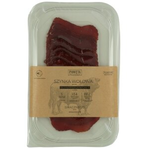 SKŁADNIKI górna zrazowa wołowa, sól, glukoza, kultury starterowe bakterii, substancja konserwująca: azotyn sodu. OPISProdukt mięsny, surowy, dojrzewający, wędzony. Pakowano w atmosferze ochronnej.Ze 154 g mięsa wyprodukowano 100 g wędliny dojrzewającej. Bez fosforanów, bez laktozy, bez glutenu.Zadbaj o zdrowe jedzenie dla siebie i swoich bliskich. Postaw na mięso najwyższej klasy. Nasze wędliny to pełnia smaku i…