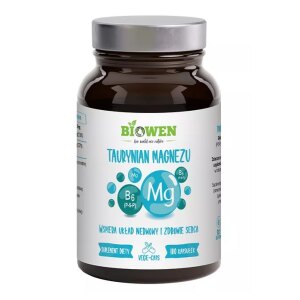 SKŁADNIKI Taurynian magnezu, witamina B6 (P-5-P pirydoksalo-5-fosforan), otoczka kapsułki: hydroksypropylometyloceluloza. Składniki aktywne w porcji dziennej (2 kapsułki)Taurynian magnezu – 1200 mgw tym jony magnezu – 96 mg (26 %)*Witamina B6 – 10 mg (714 %)**referencyjna wartość spożycia OPIS Suplement diety. Magnez i witamina B6 przyczyniają się do zmniejszenia uczucia zmęczenia i znużenia.Magnez i witamina B6…