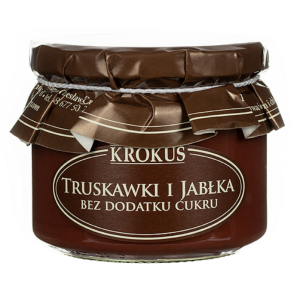 SKŁADNIKItruskawki (66,5 %), jabłka (33,5 %). Sporządzono z 225 g owoców na 100 g produktu. OPISTruskawki i jabłka przetarte i zagęszczone. Produkt pasteryzowany. Produkcja tego wyrobu bez dodatku cukru wymaga staranności. Całe owoce ze skórką, rozparzamy, przecieramy przez gęste sita i zagęszczamy w wyparkach (kociołkach próżniowych gdzie temperatura wrzenia wynosi 80°C). Dzięki czemu produkt jest…