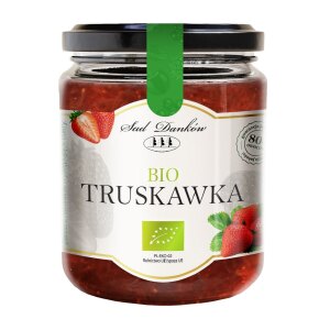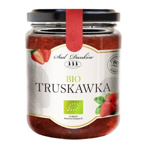 SKŁADNIKItruskawki*, cukier trzcinowy*, substancja zagęszczajaca – pektyny, reegulator kwosowości – kwas askorbinowy. (*certyfikowany składnik ekologiczny) OPIS100 g produktu sporządzono z 80 g owoców. Produkt pasteryzowany otrzymany przez odszypułkowanie owoców truskawki z dodatkiem cukru trzcinowego. Smak słodko-kwaśny charakterystyczny dla owoców truskawki, barwa zbliżona do barwy owoców. WARTOŚĆ ODŻYWCZA W 100 gWartość energetyczna – 688 kJ/162 kcal…