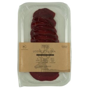 SKŁADNIKI udziec z jelenia b/k, sól, glukoza, kultury starterowe bakterii, substancja konserwująca: azotyn sodu. OPIS Produkt mięsny, surowy, dojrzewający, wędzony. Pakowano w atmosferze ochronnej. Ze 154 g mięsa wyprodukowano 100 g wędliny dojrzewającej. Bez fosforanów, bez laktozy, bez glutenu.Zadbaj o zdrowe jedzenie dla siebie i swoich bliskich. Postaw na mięso najwyższej klasy. Nasze wędliny to…