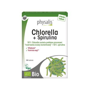 SKŁADNIKI Chlorella vulgaris Beijerinck* (50 %), Spirulina platensis* (50 %). (*certyfikowany składnik ekologiczny) Składniki aktywne w porcji dziennej – 6 tabletekChlorella vulgaris Beijerinck bio – 1200 mgSpirulina platensis bio – 1200 mg OPIS Suplement diety.Glony są uprawiane i wykorzystywane jako źródło pożywienia od ponad tysiąca lat. Physalis Chlorella + Spirulina bio, odpowiednio jednokomórkowa jasnozielona alga…