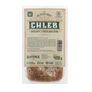 SKŁADNIKIwoda, płatki OWSIANE bezglutenowe (24,5 %), mąka ryżowa, skrobia kukurydziana, pestki dyni (8,2 %), cukier, olej rzepakowy, drożdże, błonnik roślinny (psyllium), sól, aromat, substancja zagęszczająca: hydroksypropylometyloceluloza. OPISPakowany w atmosferze ochronnej. Aby przywrócić świeżość należy podgrzać na parze lub w piekarniku. WARTOŚĆ ODŻYWCZA w 100 g Wartość energetyczna: 982 kJ/233 kcalTłuszcz: 4,1 gw tym kwasy tłuszczowe…