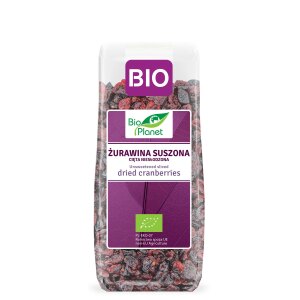 SKŁADNIKIekologiczna suszona żurawina 100 %. OPISZawiera naturalnie występujące cukry.Polecamy jako przekąskę, do zaparzania w formie herbatki oraz jako dodatek do deserów, płatków śniadaniowych, ciast, lodów, a także jako składnik sosów i potraw mięsnych. WARTOŚĆ ODŻYWCZA W 100 gWartość energetyczna 1305 kJ/311 kcalTłuszcz 2,6 gw tym kwasy tłuszczowe nasycone 0,3 gWęglowodany 54 gw tym cukry 33…
