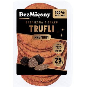 SKŁADNIKIwoda, białko PSZENNE (28 %), olej rzepakowy, skrobia ziemniaczana, aromaty (w tym aromat białej trufli 0,4 %), błonniki (bambusowy, grochowy, babki jajowatej), ekstrakty przypraw, płatki drożdżowe nieaktywne, dekstroza, sól. OPISBezmięsna o smaku trufli to wyrafinowana, w 100 % roślinna alternatywa dla tradycyjnych wędlin — stworzona z myślą o tych, którzy szukają czegoś więcej niż klasyczna…