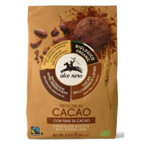 SKŁADNIKImąka PSZENNA* (48 %), cukier trzcinowy*, ziarna kakao* (10 %), tłuszcz kakaowy* (7 %), olej słonecznikowy* (6 %), kakao w proszku* (5 %), substancje spulchniające: węglany amonu, węglany sodu. (*certyfikowany składnik ekologiczny) OPISCiastka, które umilą czas każdemu miłośnikowi słodkości. Doskonale pasują do kawy czy herbaty. Sekret ich smaku tkwi w specjalnej recepturze oraz metodzie pieczenia.Opakowanie…