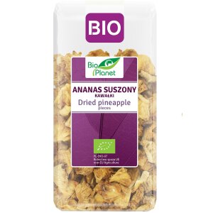 SKŁADNIKI ekologiczny ananas suszony 100 %. OPIS Ekologiczne suszone krążki ananasa to doskonała samodzielna przekąska. Polecamy również jako dodatek do słodkich sałatek, sosów bakaliowych, deserów i kotajli. WARTOŚĆ ODŻYWCZA W 100 g Wartość energetyczna 1366 kJ/323 kcalTłuszcz 0,6 gw tym kwasy tłuszczowe nasycone