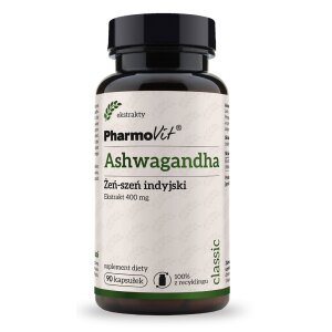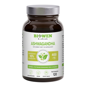 SKŁADNIKIekstrakt z ashwagandha (Withania somnifera) DER 8:1 standaryzowany na 10 % witanolidów, inulina, ekstrakt z owoców pieprzu czarnego standaryzowany na 95 % piperyny BioPerine®, otoczka kapsułki: hydroksypropylometyloceluloza. BioPerine® jest zastrzeżonym znakiem towarowym firmy Sabinsa Europe GmbH. Zalecana dzienna porcja 1 kapsułka zawieraekstrakt z ashwagandha – 400 mg w tym 10 % witanolidów – 40 mginulina…