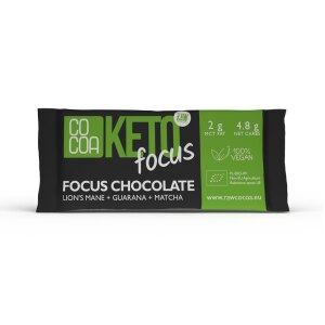 SKŁADNIKInieprażone ziarno kakaowca*, inulina*, substancja słodząca: erytrytol*, tłuszcz kakaowy*, sproszkowana guarana*, sproszkowany olej MCT z kokosa* (olej MCT z kokosa* 70 %, błonnik z akacji* 30 %), sproszkowany miąższ kokosowy*, herbata matcha zielona*, soplówka jeżowata grzyb mielony*, wanilia Bourbon*. (*certyfikowany składnik ekologiczny). Zawartość masy kakaowej min. 42 %. OPISKeto czekolada focus to pierwsza na rynku…