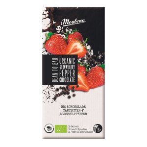 SKŁADNIKIcukier trzcinowy nierafinowany*, miazga kakaowa*, tłuszcz kakaowy*, liofilizowane kawałki truskawek* (2,5 %), pieprz czarny* (0,5 %), naturalny aromat truskawkowy, wanilia Bourbon*. (*certyfikowany składnik ekologiczny). Masa kakaowa minimum 52 %. OPISWyśmienita tabliczka czekolady, która łączy w sobie dobroć gorzkiej czekolady z aromatem i smakiem truskawek i pieprzu czarnego. Połączenie truskawki, pieprzu czarnego i czekolady to pyszna…