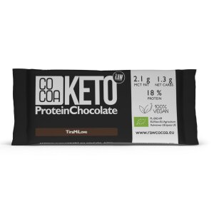 SKŁADNIKItłuszcz kakaowy*, substancja słodząca: erytrytol*, nieprażone ziarno kakao*, białko grochu*, inulina*, olej MCT z kokosa*, naturalny aromat amaretto, białko ryżowe*, naturalny aromat kakaowy*, naturalny aromat waniliowy*, kawa*. (*certyfikowany składnik ekologiczny)Zawartość masy kakaowej minimum 45%. OPISKeto czekolada proteinowa TiraMiLove to czekolada z wysoką zawartością białka bez cukru. Poza tym, Keto czekolada proteinowa TiraMiLove przygotowana jest w wersji…