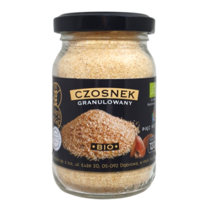 SKŁADNIKIczosnek granulowany* 100% (*certyfikowany składnik ekologiczny) INFORMACJA ALERGENNAMoże zawierać GORCZYCĘ i SELER ZALECANE WARUNKI PRZECHOWYWANIAPrzechowywać w suchym i chłodnym miejscu.