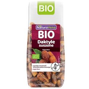 SKŁADNIKIekologiczne daktyle bez pestek suszone 100 %. UWAGADaktyle sporadycznie mogą zawierać pestki, bądź ich fragmenty. OPISPolecamy jako samodzielna słodka przekąska lub jako dodatek do porannej owsianki, deserów, ciast, powideł i wszelkiego rodzaju potraw. WARTOŚĆ ODŻYWCZA W 100 gWartość energetyczna 1204 kJ/284 kcalTłuszcz 0 gw tym kwasy tłuszczowe nasycone 0 gWęglowodany 65 gw tym cukry 59…