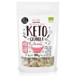 SKŁADNIKIchipsy kokosowe*, chia* – nasiona szałwii hiszpańskiej (Salvia hispanica), ziarna słonecznika*, pestki dyni*, siemię lniane brązowe*, ORZECHY LASKOWE*, czarna porzeczka liofilizowana* 3 %, substancja słodząca: erytrytol*, substancja zagęszczająca: guma ksantanowa. (*certyfikowany składnik ekologiczny) OPISDiet-Food Granole to świetny produkt śniadaniowy zalej go ulubionym mlekiem, jogurtem bądź dowolnym sokiem owocowym, lecz możesz go jeść bezpośrednio z opakowania…