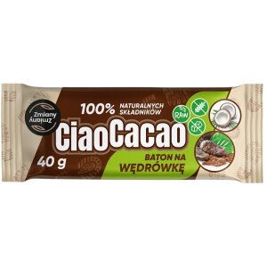 SKŁADNIKI Daktyle suszone, ORZESZKI ZIEMNE, wiórki kokosowe, kakao, ORZECHY LASKOWE. OPIS Ciao Cacao to baton w 100% naturalny, bez dodatku cukru, bezglutenowy i wegański, a przy tym intensywnie kakaowy i przyjemnie kokosowy. To idealny wybór dla każdego, kto potrzebuje porządnej dawki energii i smaku – bez zbędnych dodatków. WARTOŚĆ ODŻYWCZA W 100 gWartość energetyczna: 1868…