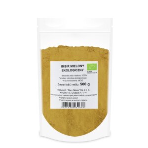 SKŁADNIKIimbir mielony* 100 %. (*certyfikowany składnik ekologiczny) OPISImbir stosuje się jako przyprawę do zup, pieczonego mięsa wieprzowego, dziczyzny i baraniny. Dodaje delikatnego smaku potrawom z ryżu, JAJEK, słodkim deserom, kompotom, różnym słodyczom.Imbir można stosować także do ogórków marynowanych czy dyni marynowanej. ZALECANE WARUNKI PRZECHOWYWANIAPrzechowywać w suchym miejscu.
