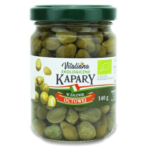 SKŁADNIKIKapary*, woda, ocet winny*, sól, regulator kwasowości: kwas mlekowy (* certyfikowany składnik ekologiczny) OPIS Idealne jako dodatek do sałatek, pizzy, potraw z makaronu oraz dań mięsnych lub rybnych. Produkt pasteryzowany. WARTOŚĆ ODŻYWCZA W 100 g Wartosc energetyczna: 97 kJ / 23 kcal Tłuszcz: 0,4 g w tym kwasy tłuszczowe nasycone: 0 g Weglowodany: 1,4 g…