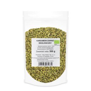 SKŁADNIKIekologiczny kardamon. WARTOŚĆ ODŻYWCZA w 100 g Wartość energetyczna: 1302 kJ / 311 kcalTłuszcz: 6,7 gw tym kwasy tłuszczowe nasycone: 0,7 gWęglowodany: 69 gw tym cukry: 41 gBłonnik: 28 gBiałko: 11 gSól: 0,1 g INFORMACJA ALERGENNAMoże zawierać orzechy. ZALECANE WARUNKI PRZECHOWYWANIAPrzechowywać w suchym i chłodnym miejscu, szczelnie zamknięte.
