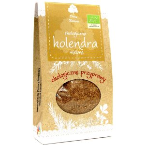 SKŁADNIKIkolendra* 100% (*certyfikowany składnik ekologiczny) OPISKolendra służy do przyprawiania wędlin (zwłaszcza mortadeli i serdelowej), pasztetów, konserw mięsnych i rybnych, likierów i wódek oraz wielu mieszanek przyprawianych np. pieprzu ziołowego i curry. ZALECANE WARUNKI PRZECHOWYWANIA Przechowywać w suchym miejscu