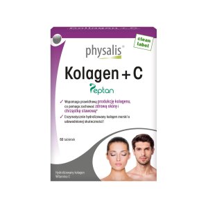 SKŁADNIKIhydrolizowany kolagen (RYBA) (92,3 %), substancje żelujące: hydroksypropylometyloceluloza, celuloza, substancja glazurująca: kwasy tłuszczowe, barwnik: węglan wapnia, witamina C (kwas L-askorbinowy). Składniki aktywne w porcji dziennej – 5 tabletekKolagen (Peptan®) – 5000 mgWitamina C (kwas L-askorbinowy) – 60 mg (75 %)**dzienna referencyjna wartość spożycia OPISSuplement diety zawierający składniki odżywcze.Physalis Kolagen + C to kompleks zawierający 1000…