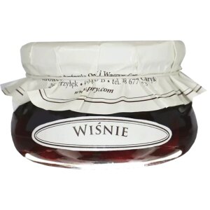 SKŁADNIKIwiśnie, cukier, syrop glukozowy (7 %) – zapobiega scukrzeniu, mączka chleba świętojańskiego – substancja zagęszczająca. OPISSporządzono z 80 g owoców na 100 g produktu. Wiśnie to owoce o bardzo małej ilości pektyny, więc konfitura jest dość rzadka. Zdecydowaliśmy się dodać do niej odrobinę mączki chleba świętojańskiego (naturalny zagęstnik), aby nieco zagęścić syrop zgodnie z życzeniem…