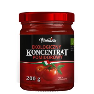 SKŁADNIKIpomidory* (*certyfikowany składnik ekologiczny) OPISKoncentrat produkowany jest z dojrzałych, świezych pomidorów ekologicznych. Umyte i przebrane pomidory są przetwarzane przez wielostopniowe odparowanie aż do uzyskania koncentratu pomidorowego. Pasta jest pasteryzowana przez umieszczenie w gorących puszkach. WARTOŚĆ ODŻYWCZA W 100 gWartość energetyczna – 398 kJ/ 94 kcalTłuszcz – 0,4 gw tym kwasy tłuszczowe nasycone – 0 gWęglowodany…