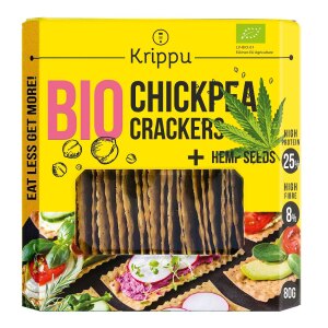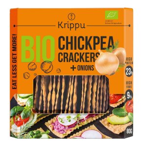 SKŁADNIKImąka z ciecierzycy* 86 %, woda, siemię lniane*, nasiona słonecznika*, proszek cebulowy* 2 %, płatki cebuli* 1 %, sól himalajska, mieszanka pieprzu*, koper*, oregano*, kurkuma*. (*certyfikowany składnik ekologiczny) OPISKrakersy z ciecierzycy KRIPPU zawierają ponad 20% białka, co plasuje je wśród produktów o najwyższej zawartości białka pod względem wartości odżywczej.Podstawowym składnikiem KRIPPU jest ciecierzyca.Na Łotwie produkt…