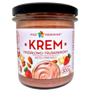SKŁADNIKIpasta MIGDAŁOWA 56 %, czekolada biała bez dodatku cukru [tłuszcz kakaowy, MLEKO pełne w proszku 25 %, substancje słodzące (erytrytol, glikozydy stewiolowe 0,015 %), odtłuszczone MLEKO w proszku 10 %, inulina, emulgator (lecytyny ze słonecznika), naturalny aromat waniliowy], olej kokosowy, truskawki liofilizowane 3,8 %, naturalne aromaty. OPISKrem przeniesie Cię do migdałowo – czekoladowo – truskawkowej…