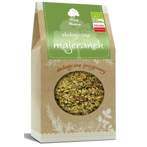 SKŁADNIKIekologiczny majeranek suszony 100 %. OPISMajeranek dodaje się głównie do kiełbas, tłustych mięs, pieczeni wieprzowej, baraniej, jagnięcej. Nadaje się wspaniale do przygotowywania zup jarzynowych, pomidorowych, RYB, pasztetów i omletów. WARTOŚĆ ODŻYWCZA W 100 gWartość energetyczna – 1135 kJ/271 kcal Tłuszcz – 7,0 g w tym kwasy tłuszczowe nasycone – 0,5 g Węglowodany – 61 g…