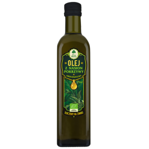 SKŁADNIKIolej z nasion pokrzywy* 100 %. (* certyfikowany składnik ekologiczny) WARTOŚĆ ODŻYWCZA W 100 mlWartość energetyczna: 3700 kJ/884 kcalTłuszcz: 93 gw tym kwasy tłuszczowe nasycone: 7 gWęglowodany: 4 gw tym cukry: 0 gBłonnik: 0 gBiałko: 0 gSól: 0 g ZALECANE WARUNKI PRZECHOWYWANIAPrzechowywać w chłodnym i zaciemnionym miejscu, a po otwarciu w lodówce.