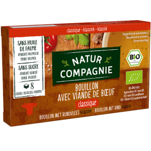 SKŁADNIKI sól morska, skrobia kukurydziana*, sproszkowana wołowina* (8 %), tłuszcz wołowy*, olej shea*, pomidory*, prażona cebula*, marchew*, czosnek*, lubczyk*, borowiki*, pietruszka*, pieprz*, tymianek*, rozmaryn*. (*certyfikowany składnik ekologiczny) WARTOŚĆ ODŻYWCZA W 100 g przygotowanego bulionuWartość energetyczna: 23 kJ/6 kcal Tłuszcz: 0,4 g w tym kwasy tłuszczowe nasycone: 0,2 g Węglowodany: 0,4 g w tym cukry: 0,1…