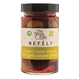 SKŁADNIKIwoda, oliwki bez pestek* 47,4 % (kalamata*, zielone*), ocet winny czerwony*, sól morska, oregano*, regulator kwasowości: kwas cytrynowy. (*certyfikowany składnik ekologiczny) WARTOŚĆ ODŻYWCZA W 100 g Wartość energetyczna 835 kJ/203 kcal Tłuszcz: 21 g w tym kwasy nasycone: 3,2 g Węglowodany: 0,6 g w tym cukry: