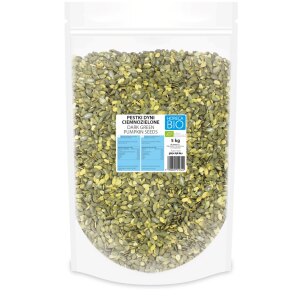 SKŁADNIKIekologiczne pestki dyni ciemnozielone 100 % OPISEkologiczne pestki dyni to wyśmienita przekąska dla każdego. Doskonale sprawdzają się w codziennej kuchni. Można je dodawać do sałatek, zup lub posypywać desery. WARTOŚĆ ODŻYWCZA W 100 gWartość energetyczna 2454 kJ/593 kcalTłuszcz 49 gw tym kwasy tłuszczowe nasycone 8,7 gWęglowodany 4,7 gw tym cukry 1,4 gBłonnik 6,0 gBiałko 30…
