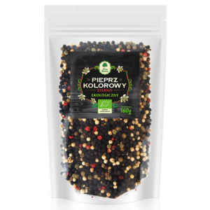 SKŁADNIKI Pieprz czarny*, pieprz biały*, pieprz różowy*, pieprz zielony* (*certyfikowany składnik ekologiczny) OPISPieprz kolorowy charakteryzuje się wyrazistym korzennym i delikatnie odświeżającym smakiem oraz intensywnym aromatem. Doskonale nadaje się do mięs, RYB, sosów, marynat oraz sałatek. Jest również doskonałym elementem dekoracyjnym. ZALECANE WARUNKI PRZECHOWYWANIAPrzechowywać w suchym miejscu